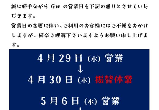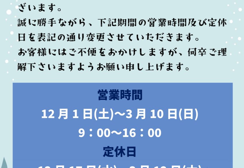 いつもご利用いただき、ありがとうございます。 3月1日(金)より下記の通り営業時間を変更させていただきます。 開店時間 9:00 閉店時間 17:00 ご不便おかけしますがよろしくお願い致します。